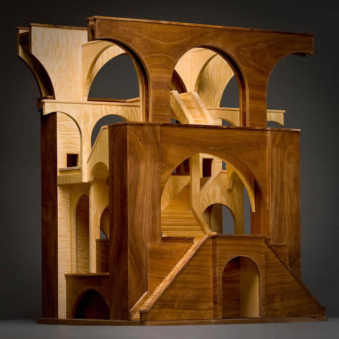 Piranesi Prisons Series, Prison # 2 This second box in the series basesd on Gian-Battista Piranesi's remarkable collection of etchings of imaginary prisons is inspired by the verticality, monumentality, and bizarre symmetry of some of Piranesi's prisons. The outer wood is walnut and the inner wood is figured maple. There are two compartments under the floors. The box measures 18"h - 14"w - 14"d.
