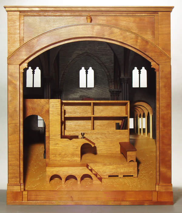 Though finished on all sides, this box is more a diorama than a full sculpture like my other boxes. To capture the sense of perspective in the painting, I decided to make the floor have a rake of 25 degrees and to foreshorten all the structures so that the space would appear much deeper than it actually is. This involved making all the structures angle back to an imaginary vanishing point. I tried to stay true to the dimensions in the painting and to keep the clutter to a minimum, suggesting his scholarly life with just a few objects. The dimensions of the box are 16" high by 13 inches wide by 10 inches deep. The outer wood is cherry, and the inner woods are mahogany for the study, bird's eye maple for the floor, and bog oak for the church interior. There are three compartments. |