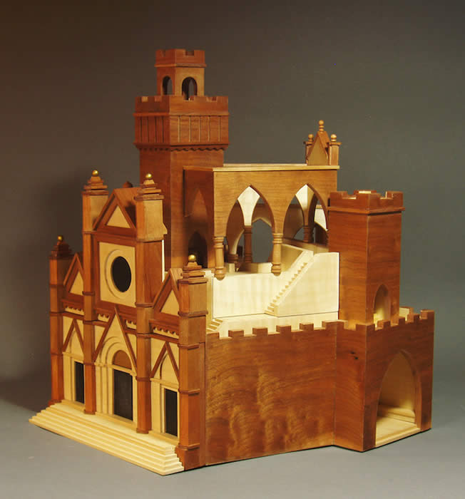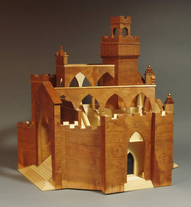 of cardboard and scotch-tape. The finished box has four entrances, ten stairways, thirty arches, nine columns, and two towers.
