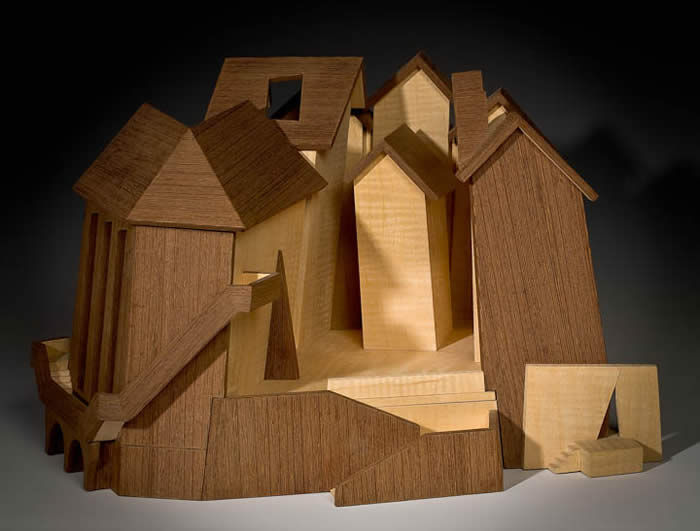 Dr. Caligari's Town This miniature village/stage set is inspired by the famous 1919 German expressionist horror film, "The Cabinet of Dr. Caligari". It is my fantasy recreation of Holstenwall, the little hill town where the story takes place, and my attempt to capture in an abstracted way the eerie feel of the sets of this iconic film. Each of the four faces of the box references one of the movie sets. This face shows the town square and entrance to Dr. Caligari's tent. The box is 14"h - 22"w - 21"d. Click on VIDEO to see how the box opens.