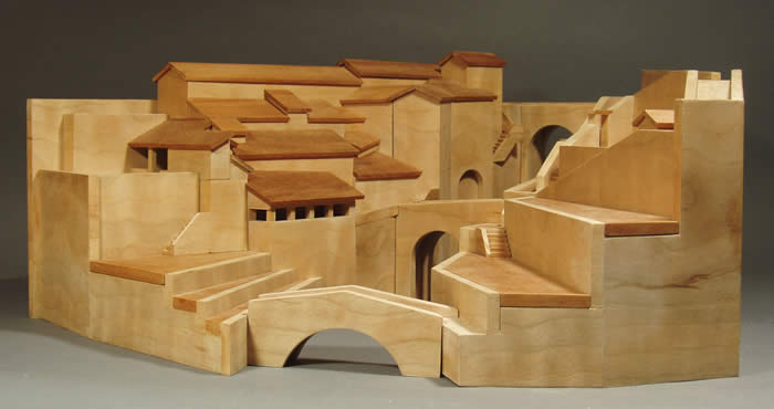 the ravine bed or rushing stream but focused on abstracting the man-made aspects – the buildings and terraces -