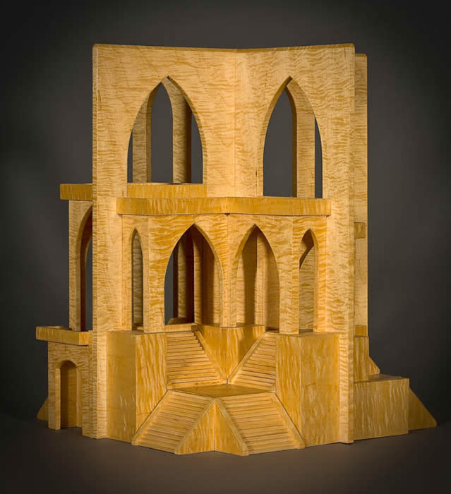 Heaven and Hell Reliquaries - Heaven This sculpture box is composed of four "rooms", each with stairways and balconies that open onto the adjoining rooms. Each room is symmetrical, though the entire composition is not. All the stairways act as pulls for the six drawers contained in this box under the floors. The wood is a highly figured maple. Heaven measures16"h - 14"w - 15"d. Click on VIDEO to see how the box opens.