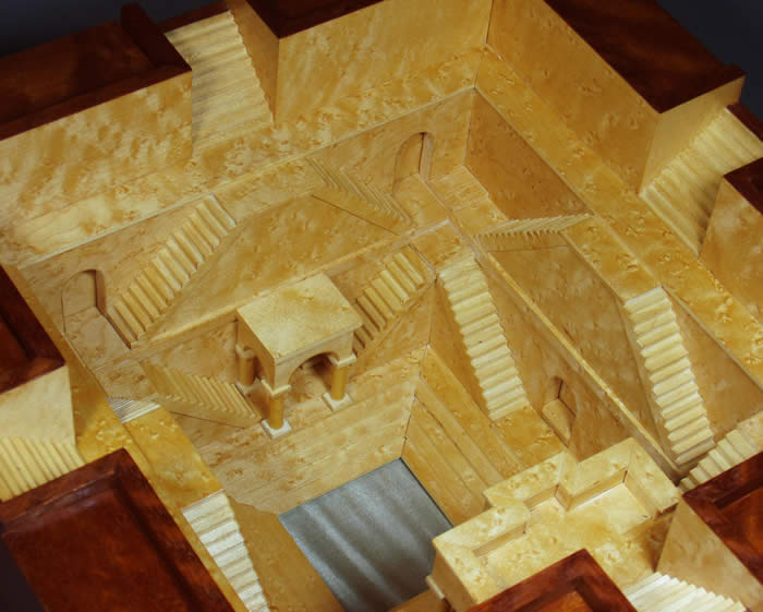 Step Well Series # 1 - Ramkund Step Well This is my first box inspired by the incredible step wells of northern India. Each box begins with a specific step well, but I then adapt the design to include elements from other step wells and my imagination. This is a classic square step well with three levels of stairs and several pavilions around a central well. The surface or ground level of the box has four stairways leading down into the well, and then eight stairways lead down to the next level and six more stairways lead down to the central pool. Watch the VIDEO of how the Step Well Series boxes open.