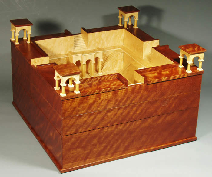 Step Well Series # 1 - Ramkund Step Well One has to imagine that the structure of the box is below ground level and that only the four little pavilions and the entrances to the stairways are visible from the ground. Inside is a two-level temple and a small pavilion. Each side of the box has a drawer that pushes out from the inside, and there are twelve compartments on the top level.Ther are also two secret inner compartments. The outer wood is figured makore and the inner wood is bird's eye maple. The box is 11"h - 14 "w - 14"d.