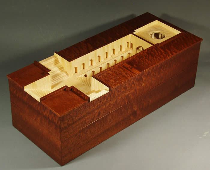 Serp Well Series # 3 - Agrasen Step Well The incredible step well at Agrasen in Rajastan is the inspiration for my third box based on Indian step wells. Unlike the many square, symmetrical step wells, this one is long and narrow with the well at the end of a very long staircase. I used the basic design of Agrasen for this box, but added elements from other step wells. The outer wood is pommele sapele and the inner wood is English maple. The box is 7"h - 22"l -10"w. Watch the VIDEO of how the Step Well Series boxes open.