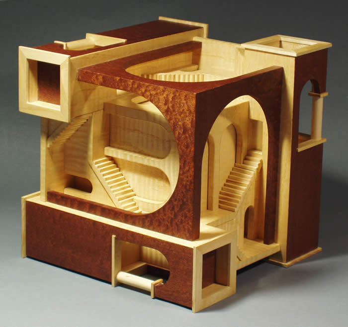 M. C. Escher Series, Box # 2 This view of the box removed from its stand shows more clearly the three identical facades, with their two stairways and three arches, in their three different orientations. There is a small compartment in each of the corner towers and a box cube contained within the structure. To access the cube, one of the bottom faces of the box must be removed, and then the inner cube box can be lifted out.