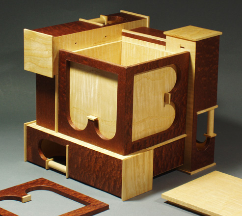 M. C. Escher Series, Box # 2 This shows the box turned "upside down" with its three underneath faces showing. The outer layer of the top face has been removed (on the ground to the left), as well as the lid to the inner cube box (on the ground to the right). This inner box can be lifted out, with the result that one can look through the open structure of the box (see next image). Off its stand the box measures 9"h - 9"w - 9"d, and the inner cube box is 5".
