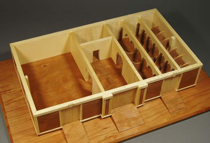 Gore Place Carriage House When the loft floor is removed, the main floor rooms are revealed with highly detailed stalls with arched enties and curved stall walls, and stall floors with channels that once directed urine and dung to a trough with a hinged cover. The cover was lifted and the waste swept down to the basement below.This box also has a cover that can be opened. The dimensions are large enough that a hand can comfortably explore the various details of the interior.