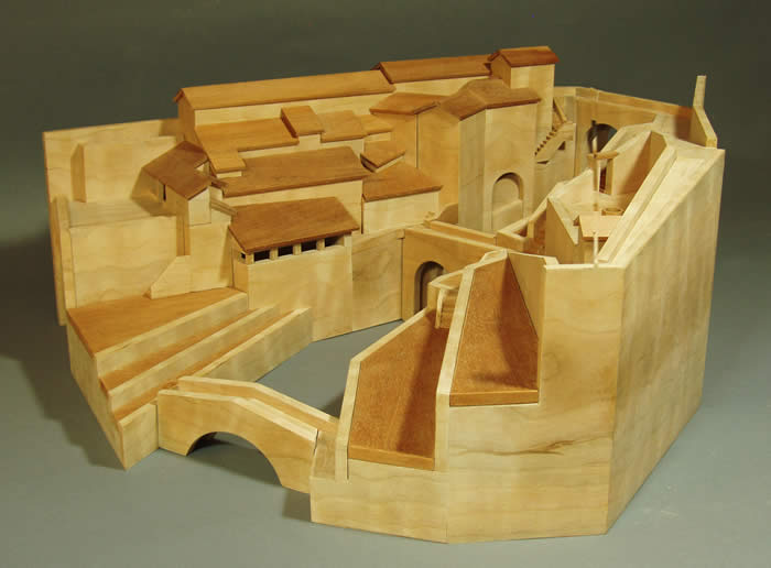 Eremo Le Celle The Franciscan monastery of Le Celle was founded by the saint himself on a hillside outside the walls of Cortona, Italy, in 1221. The site is dramatic – a deep ravine carved by a rushing stream divides a jumble of dry stone buildings on one side from terraces of gardens and orchards linked by ramps and stairways on the other. Three bridges cross the ravine at different heights.The site immediately enthralled me when I visited it, and I took a few photos, wondering if I could ever use it as the starting point for a box. Several years later, I’ve made my box. CLICK to see image of the actual monastery.