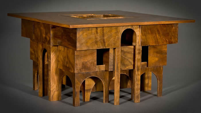 Though medieval reliquaries were the resting place for revered and holy relics, I see no reason why relics of a darker and more profane nature should not have their own special place. Every face of this little Hell is symmetrical and has two drawers that can be opened from the outside, as well as one that opens into the inner courtyard. Hell is 9"h - 15"w - 15"d. Click on VIDEO to see how the box opens. |